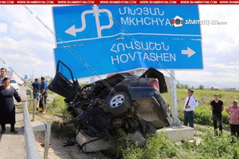 Արարատի մարզում. Mercedes-ը մխրճվել է ցուցանակի մեջ. վիրավորները նախկին գյուղապետի որդիներն են (ֆոտո)