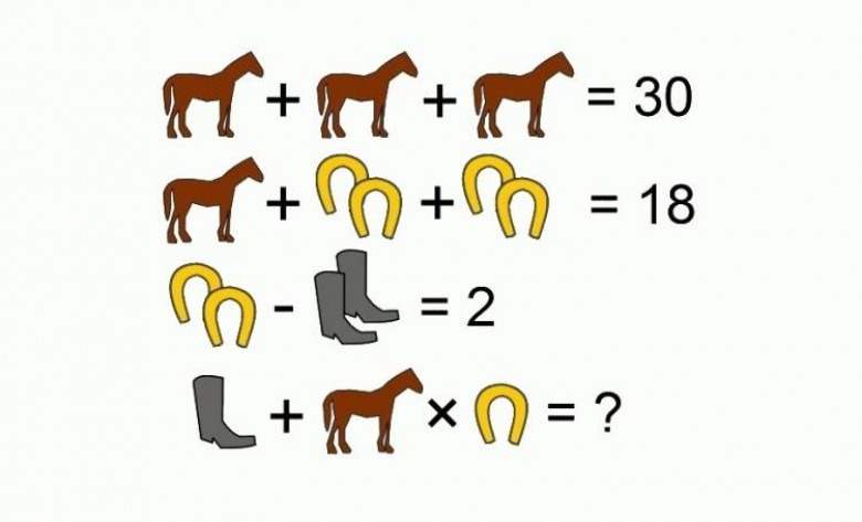 Ճիշտ պատասխանն է` 21: Դժվար չէ հասկանալ, որ մեկ ձին հավասար է տասի, զույգ նալերը` չորսի, երկարաճիտ կոշիկները` երկուսի: Մնում է ուշադիր նայել վերջին տողին և հասկանալ, որ այդ օրինակում կա միայն մեկ նալ և մեկ երկարաճիտ կոշիկ: Ստացվում է` 1+10x2: