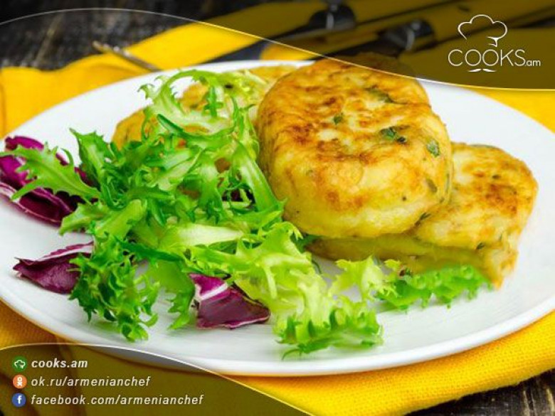 - Կարտոֆիլը եփում ենք, կեղևազրկում և անցկացնում քերիչով: Ավելացնում ենք ալյուրը, փխրեցուցիչը, աղը և լավ խառնում ենք: Այնուհետև լցնում ենք կաթն ու ձուն և զանգվածը լավ խառնում ենք: Ավելացնում ենք քերած կարտոֆիլը, կտրատած մաղադանոսը, ֆետան և խառնում ենք: