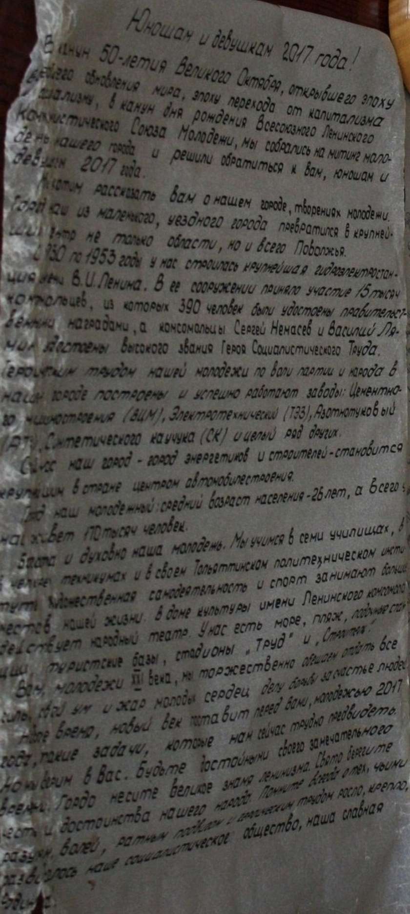 Այս տարի՝ 2017-ին լրանում է Հոկտեմբերյան հեղափխության 100-ամյակը և պատահական չէ, որ մի շարք ժամանակի պարկուճներ հենց այս թվականին են հասցեագրված: Օրինակ այս մեկը, Տոլյատիից: Այն տեղադրել էին կոմսոմոլեցները, 1967 թ-ին: Այդ տարիների կարծում էին, որ իրենց քրտանաջան աշխատանքի շնորհիվ, 50 տարի հետո կոմունիզմը տարածված կլինի ողջ աշխարհովև ամենուր երջանկություն կտիրի...