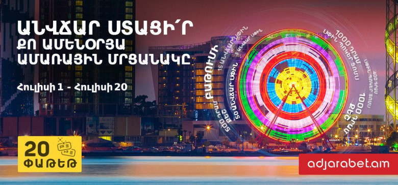 Հուլիսի 1-ից adjarabet.am կայքը մեկնարկել է նոր էքսկլյուզիվ ակցիա՝ Աջարայի Ամառը: Յուրաքանչյուր adjarabet օգտատեր կարող է բոլորովին անվճար շահել անմոռանալի ամառային ուղևորություն և այլ երաշխավորված մրցանակներ ամեն օր:
