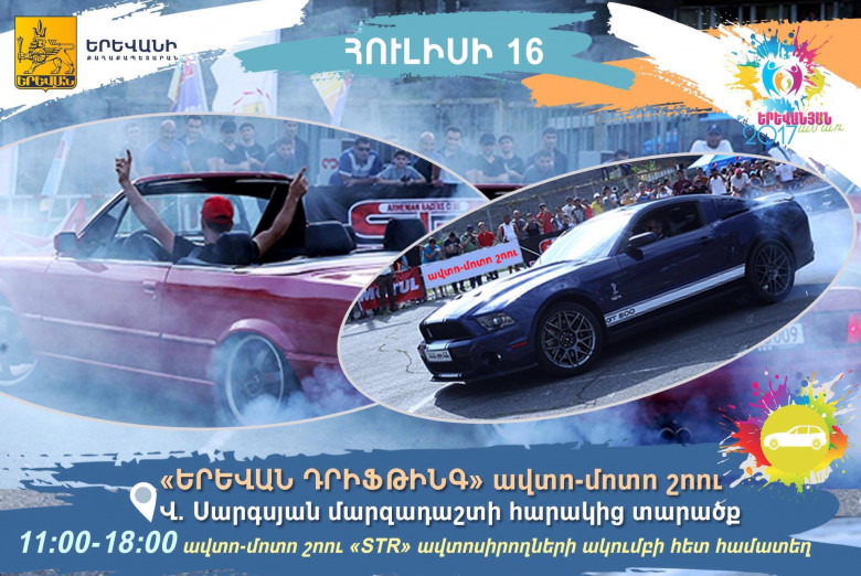 «Երևանյան ամառ 2017 » եռամսյա ծրագրի շրջանակում ս/թ հուլիսի 16-ին ժամը 11:00–ից, «Երևանյան դրիֆթինգ» ավտոշոու խորոգրով կկայանա սպորտային ավտոմեքենաների մրցաշարը: