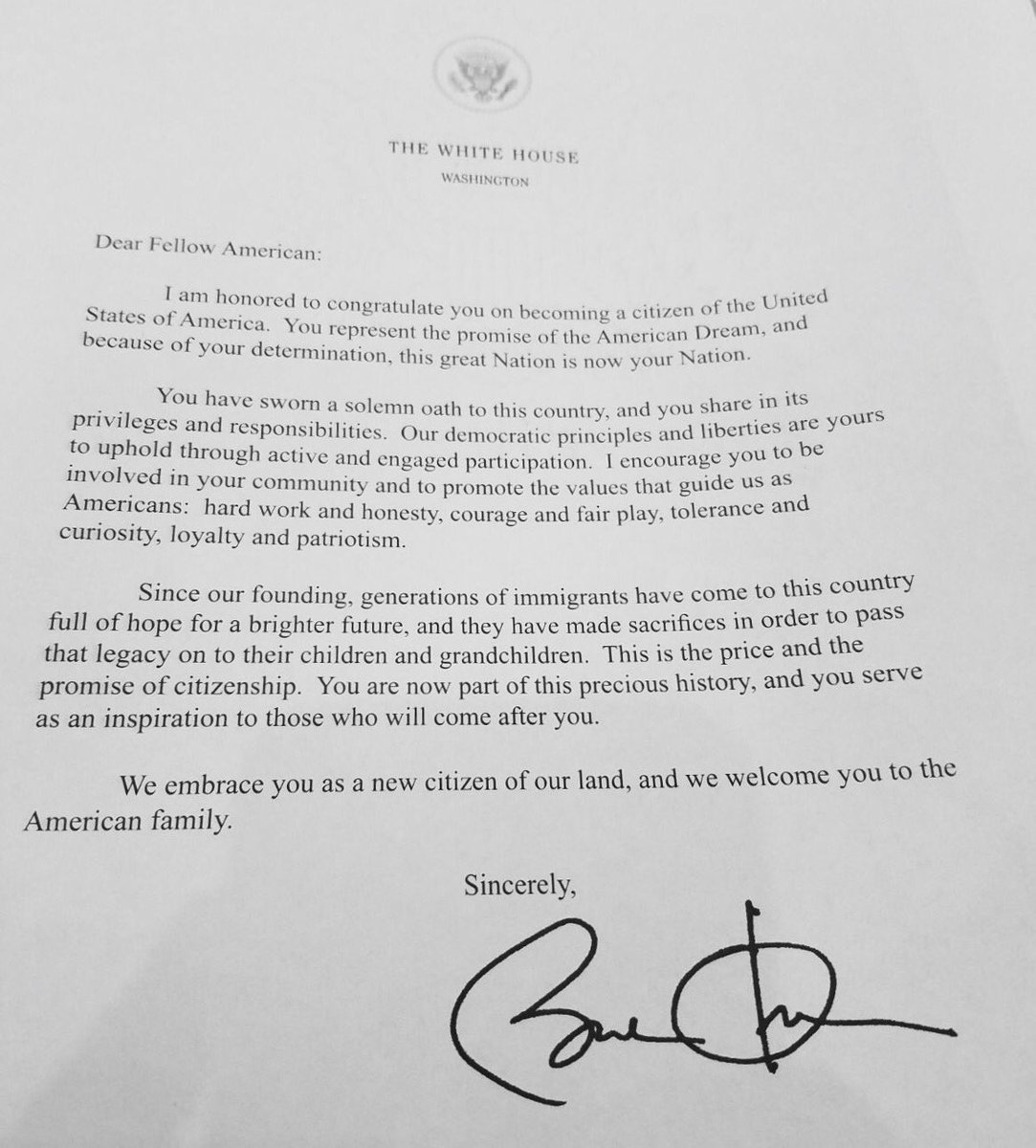 ՄիջազգայինԱյս մասին հայտնում է ТАСС գործակալությունը` մեջբերելով վերջինիս կնոջ հաղորդագրությունը: «Ամուսինս, որը ծնվել է Մեծ Բրիտանիայում, երդում է տալիս քաղաքացիություն ստանալիս: Նորահայտ ամերիկացիների համար նախատեսված թղթապանակում ողջույնի նամակ է նախագահ Օբամայից», - նշել է կինը: