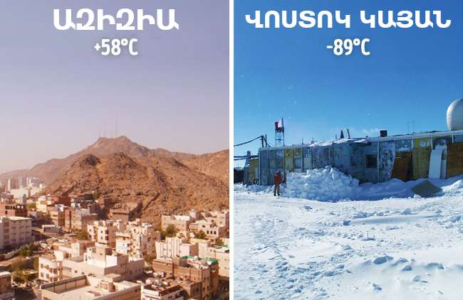 Մեր մոլորակի ամենաշոգ վայրը Լիբիայի Ազիզիան է, որտեղ ջերմաստիճանը հասնում է +58 աստիճանի։ Ամենացուրտ վայրը Անտարկտիկայում է, որտեղ լինում է 73 աստիճան ցուրտ։ Սակայն երբևէ գրանցված ամենացածր ջերմաստիճանը եղել է Ռուսաստանի Վոստոկ կայանում, որտեղ 1983 թվականի հուլիսի 21-ին եղել է 89.2 աստիճան ցուրտ։