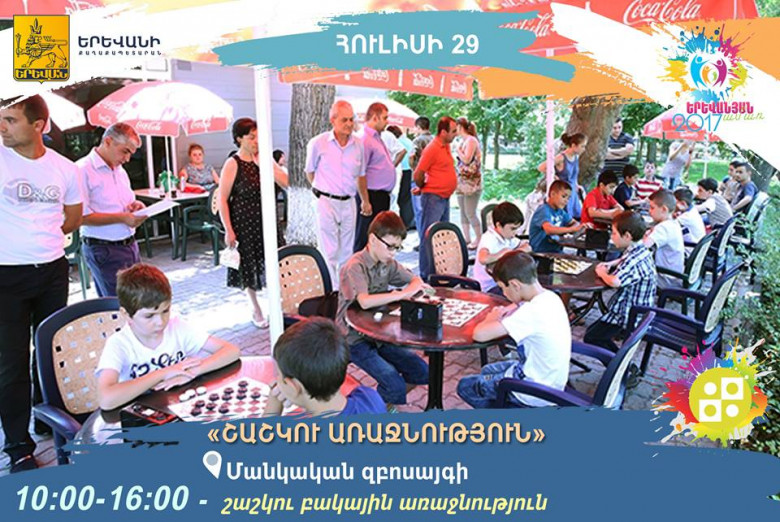 Երևանի քաղաքապետարանի «Երևանյան ամառ 2017» եռամսյա միջոցառումների ծրագրով նախատեսված Երևանի քաղաքապետարանի փոխանցիկ գավաթի մրցաշարի շրջանակում հուլիսի 29-ին` ժամը 10:00-ից մինչև 16:00-ը, մայրաքաղաքի մանկական զբոսայգում կանցկացվի շաշկու բակային առաջնությունը: