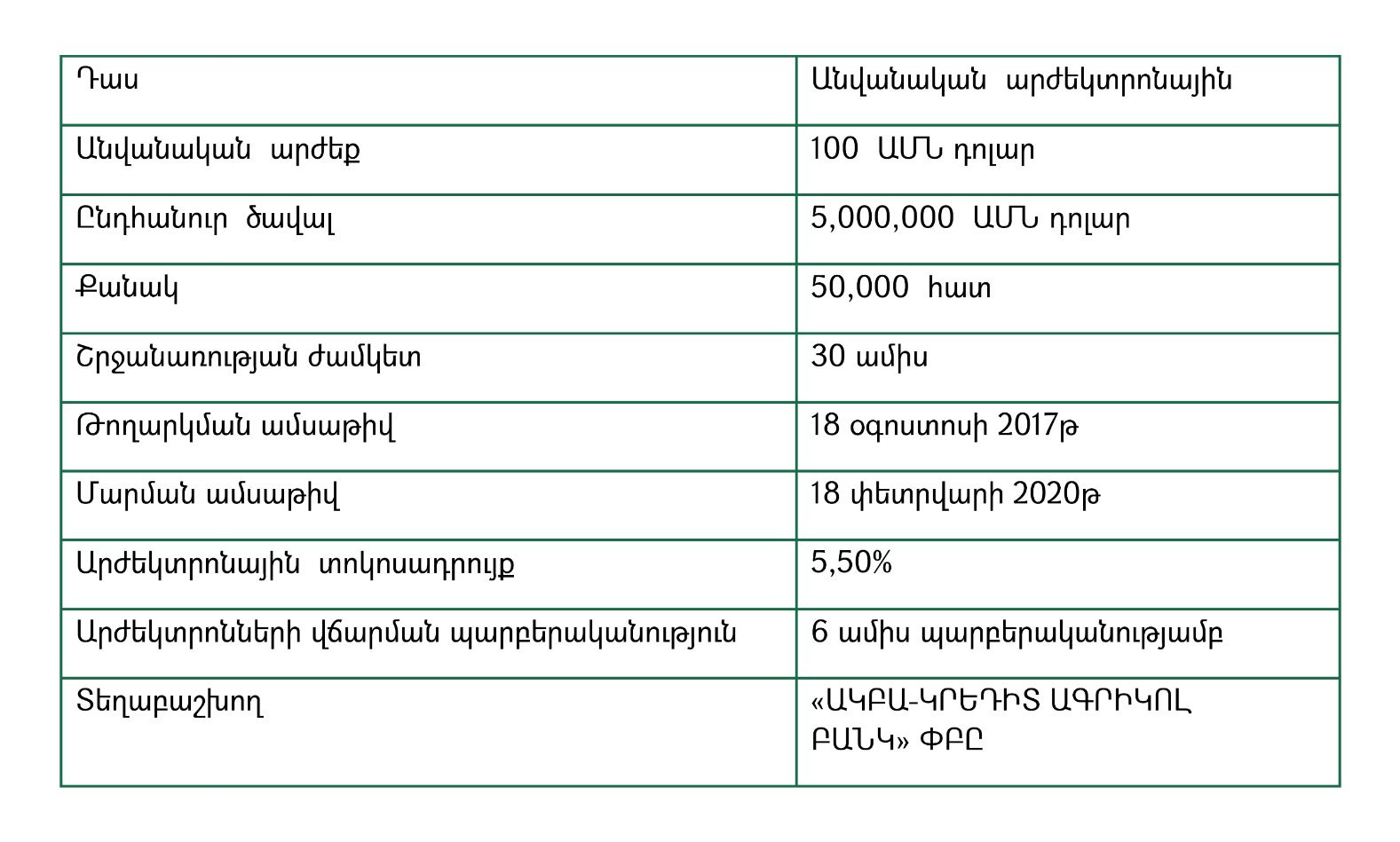 ՀասարակությունԱԿԲԱ-ԿՐԵԴԻՏ ԱԳՐԻԿՈԼ բանկը 2017թ.-ի օգոստոսի 18-ին հրապարակային առաջարկի միջոցով սկսելու է տեղաբաշխել 5 մլն ԱՄՆ դոլար ընդհանուր ծավալով, տարեկան 5,5% եկամտաբերությամբ արժեկտրոնային ոչ փաստաթղթային պարտատոմսեր 30 ամիս շրջանառության ժամկետով։ Մեկ պարտատոմսի