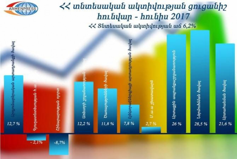 ՏնտեսությունՀայաստանի տնտեսական ակտիվության ցուցանիշը 2017 թվականի հունվար-հուլիսին 6,2 տոկոսով գերազանցել է նախորդ տարվա նույն ժամանակահատվածի ցուցանիշը: ՀՀ ազգային վիճակագրական ծառայությունը ներկայացրել է երկրի սոցիալ-տնտեսական վիճակը բնութագրող ընթացիկ-օպերատիվ ամփոփմամբ ստացված նախնական հիմնական մակրոտնտեսական ցուցանիշները: Անկում է գրանցվել միայն շինարարության և գյուղատնտեսության համախառն արտադրանքի ոլորտներում: