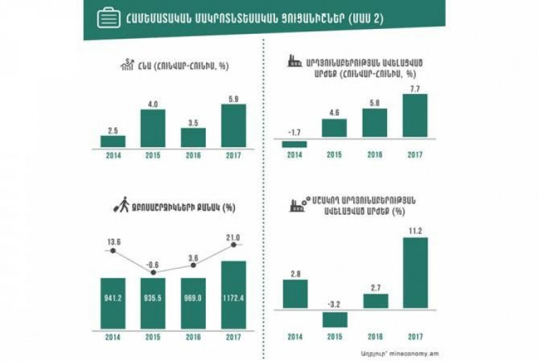 Մակրոտնտեսական ցուցանիշների համեմատական վերլուծությունը փաստում է, որ այս տարվա ինն ամիսների տնտեսական ակտիվության աճը ևս ամենաբարձրն է վերջին չորս տարիներին: «Արմենպրես»-ի փոխանցմամբ՝ մասնավորապես, տնտեսական ակտիվությունը 2017-ի ինն ամիսներին 2016-ի նույն ժամանակահատվածի համեմատ աճել է 5.1 տոկոսով, այն դեպքում, երբ 2016-ի ցուցանիշը 1.6 տոկոս էր: 2014-ի հունվար-սեպտեմբերին տնտեսական ակտիվության ցուցանիշը նախորդ տարվա համեմատ աճել էր 4.8 տոկոս: Արդյունաբերական արտադրանքի ծավալը 2017-ի ինն ամիսներին նախորդ տարվա համեմատ աճել է 11.9 տոկոսով, այս ցուցանիշը շուրջ 6 անգամ ավելի է 2014-ին արձանագրված ցուցանիշից: Ծառայությունների ծավալի մասով ևս կայուն աճ կա նախորդ տարիների համեմատ: Եթե 2014-ի ինն ամիսներին ծառայությունների ծավալը նախորդի համեմատ աճել էր 6.8, 2015-ին՝ 2.5, 2016-ին՝ 8.3 տոկոսով, ապա 2017-ի հունվար-սեպտեմբերին աճը կազմել է 12.8 տոկոս: