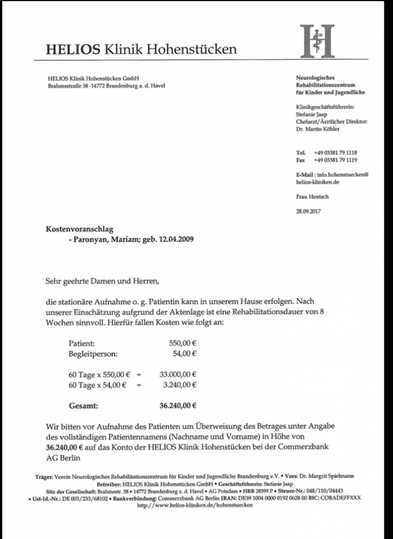 ՀասարակությունԲարև Ձեզ, ես Պարոնյան Մարիամի մայրն եմ:Մարիամիկը ծնվել է ՄՈՒԿ ախտորոշմամբ:Նա արդեն 8 տարեկան է և այս տարիների ընթացքում մենք շատ երկար ճանապարհ ենք անցել,2 անգամ վիրահատվել,ֆիզիո,էրգո,հիդրոթերապիաներ անցել անընդմեջ,2014 թ-ին մեծ վերականգնողական կուրս ենք անցել Գերմանիայի Հելիոս կլինիկայում բարերարների և առաջին տիկին Ռիտա Սարգսյանի հովանավորությամբ ,հիմա մեզ այնտեղից նորից բուժումը շարունակելու հրավեր է եկել և մեզ պակասում է 10000 եվրո:Խնդրում եմ իմ հայրենակիցներին ևս մեկ անգամ սատար կանգնել և օգնել մեզ հաղթանակին հասնել և որ իմ բալիկն էլ լիարժեք կյանքով ապրի :