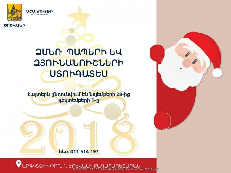 Հասարակություն«Նոր Տարին Երևանում 2018» միջոցառումների ծրագրին ընդառաջ՝ Երևանի քաղաքապետարանի աշխատակազմի մշակույթի վարչությունը հայտարարում է Ձմեռ Պապերի, Ձյունանուշների և հեքիաթների հերոսների ստուգատես, որի շրջանակում Նոր տարվա և Սուրբ ծննդյան տոներին Հանրապետության և Ազատության հրապարակների տոնական միջոցառումներին մասնակցելու և գործունեություն իրականացնելու նպատակով կազմակերպություններին և անհատներին առաջարկվում է արտոնագրվել։