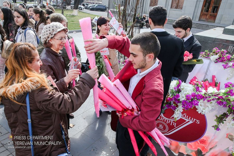 Հասարակություն Երևանի քաղաքապետարանի նախաձեռնությամբ վաղ առավոտից մայրաքաղաքի տարբեր հատվածներում կին անցորդների ու հյուրերին դիմավորել են Երևանի քաղաքապետի շնորահավորական բացիկներով և ծաղիկներով: Արամ Խաչատրյանի արձանի հարևանությամբ Երևանի Ա. Տեր-Ղևոնդյանի անվան երաժշտական դպրոցի սաները կանանց ու մայրաքաղաքի մասին երգերի հնչյուններով են լցրել Երևանի տոնական մթնոլորտը: