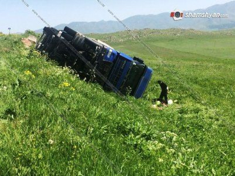 Արագածոտնում 30-ամյա վարորդը ապակե տարաներով բարձված բեռնատարով շրջվել է (ֆոտո)