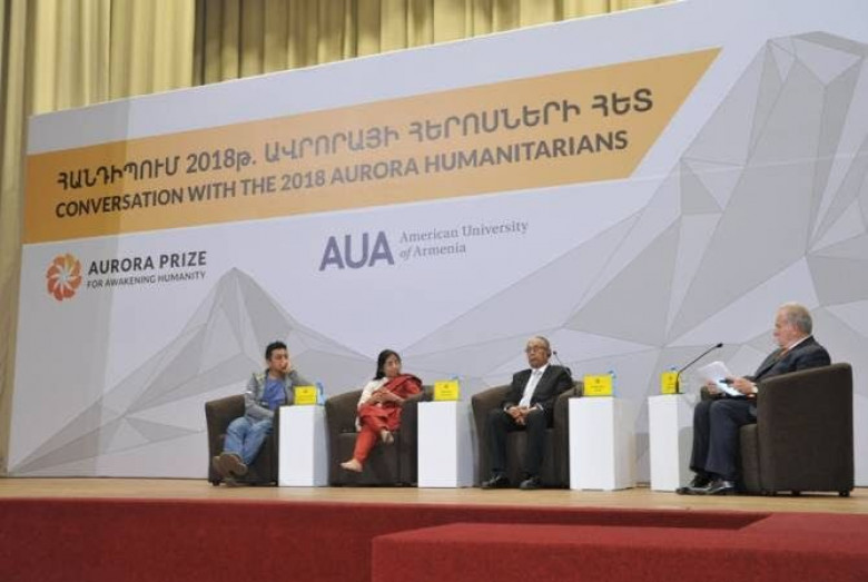 Հասարակություն«Ավրորա» 2018-ի մրցանակի հավակնորդ Չո Լա Աունը վստահ է` եթե իրեն շնորհվի այդ պատվաբեր մրցանակը, ինքն ավելի մեծ աշխատանք կանի, քան նախկինում: Մյանմայի ռոհինջաներին պաշտպանող հերոսն այս մասին ասաց Հայաստանում հարյուրավոր մարդկանց հետ հանդիպմանը: