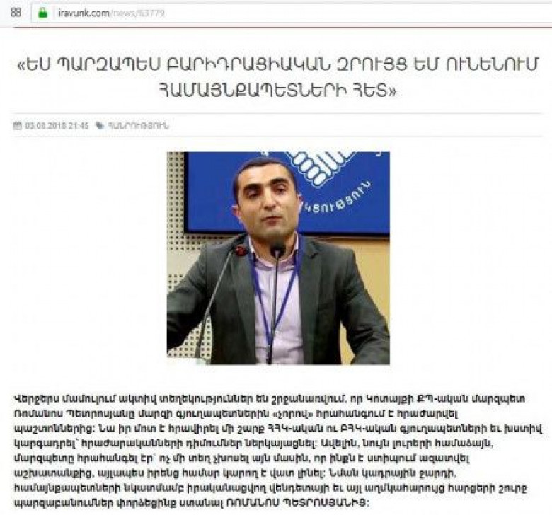 Արդեն տևական ժամանակ է, որ Կոտայքի մարզում իրավիճակը հանդարտ չէ, իսկ պատճառը նորանշանակ մարզպետ Ռոմանոս Պետրոսյանն է: Մարզպետի պաշտոնը նա երևի շփոթել է կալվածատիրջ կարգավիճակի հետ, և նշանակվելու առաջին իսկ օրից իսկական տեռոր է սկսել Կտոայքի մարզի գյուղապետերի դեմ: