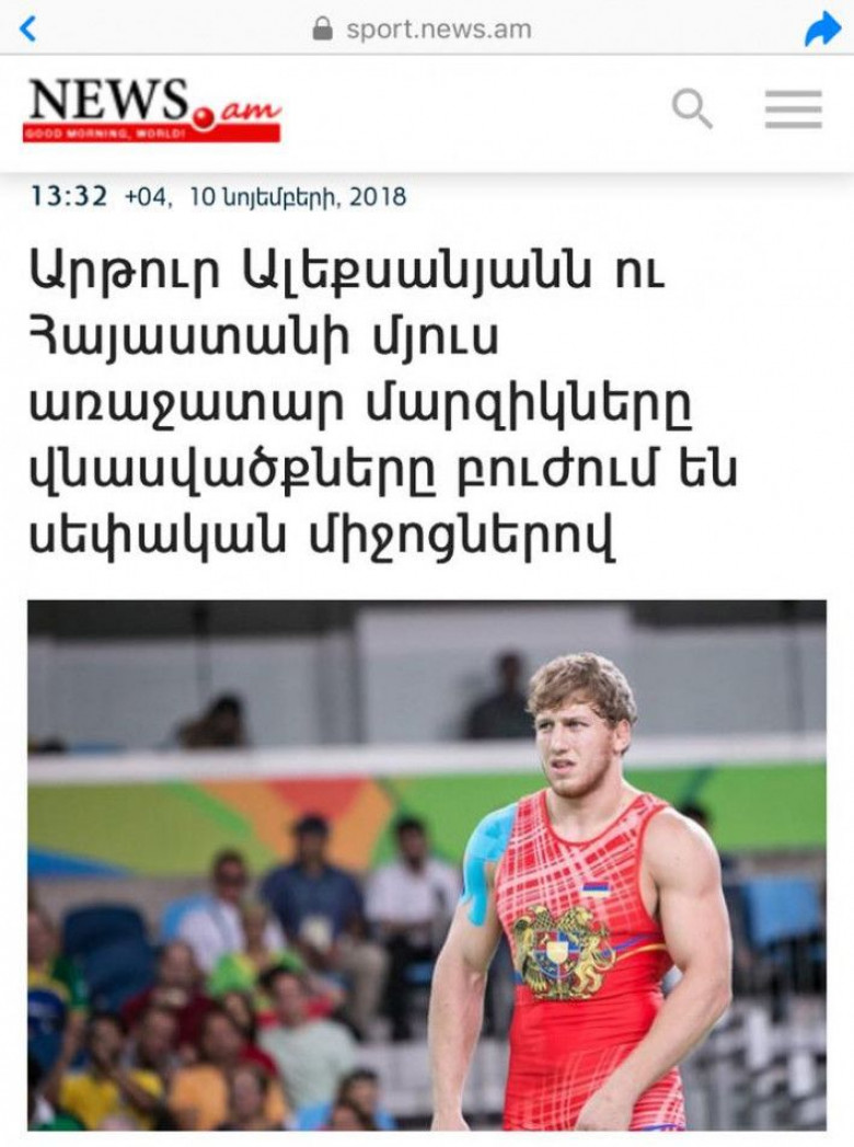 News.am լրատվականում հոդված է հրապարակվել այն մասին, որ օլիմպիական չեմպիոն Արթուր Ալեքսանյանը իր վնասվածքները բուժում է սեփական միջոցներով, իսկ վերջում էլ ամբողջ պատասխանատվությունը փորձ է արվում բարդել ՀԱՕԿ-ի վրա: