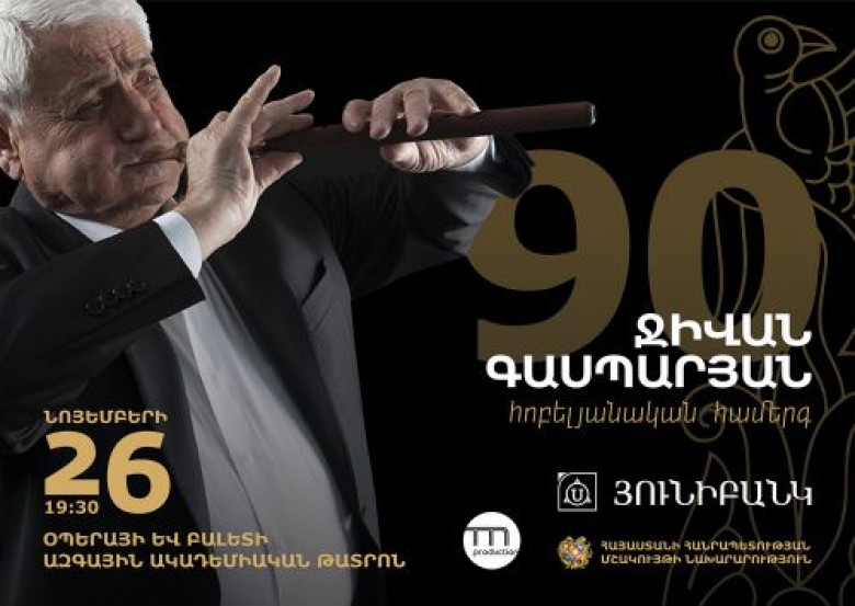 ՀասարակությունՆոյեմբերի 26-ին ՀՀ մշակույթի նախարարության նախաձեռնությամբ և Յունիբանկի աջակցությամբ Ա․ Սպենդիարյանի անվան օպերայի և բալետի ազգային ակադեմիական թատրոնում տեղի կունենա դուդուկի աշխարհահռչակ վարպետ Ջիվան Գասպարյանի 90- ամյակին նվիրված հոբելյանական համերգ: