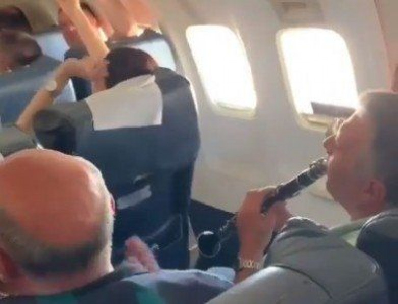Ինքնաթիռի մնացած ուղեւորները երաժշտության տակտով ծափ են տալիս՝ ամեն կերպ ոգեւորելով երգողներին, իսկ ոմանք նկարահանում են։