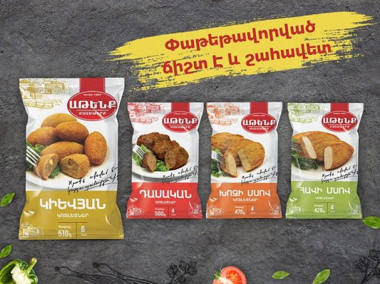 Այսպիսով՝ նոր և հարմարավետ փաթեթավորումներով են լինելու «Աթենք» ապրանքանիշի հետևյալ կիսապատրաստվածքները՝ ռուսական պելմեններ, խինկալի, մինի խինկալի, ռոլլ, կիևյան կոտլետ, դասական կոտլետ, հավի մսով կոտլետ, խոզի մսով