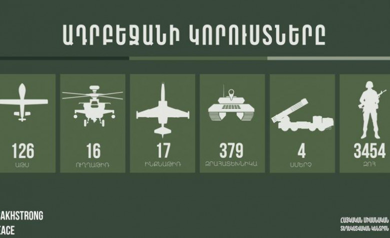 ՄիջազգայինՀայկական միասնական տեղեկատվական կենտրոնը ներկայացրել է հակառակորդի կորուստները սեպտեմբերի 27-ից ի վեր: Ըստ այդմ, Ադրբեջանի կորուստները հետեւյալն են. 126 ԱԹՍ, 16 ուղղաթիռ, 17 ինքնաթիռ, 379 զրահատեխնիկա, 4 «Սմերչ» 3454 սպանված: