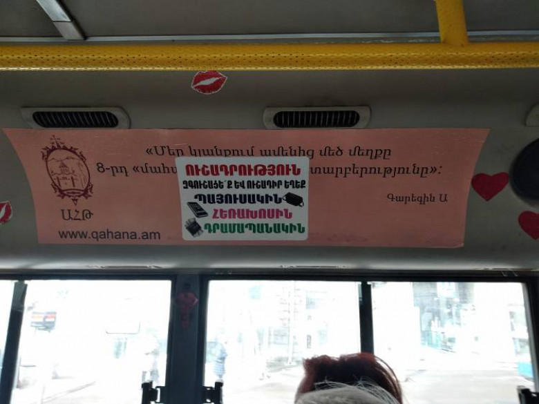 Այս լուսանկարն արվել է Երեւանի ներքաղաքային թիվ 41 երթուղու ավտոբուսներից մեկում: Նախ փակցվել է Ամենայն հայոց կաթողիկոս հանգուցյալ Գարեգին Ա-ի խոսքը. «Մեր կյանքում ամենից մեծ մեղքը 8-րդ «մահացու մեղք»-ն է` անտարբերությունը»: Իսկ ինչ-որ ժամանակ անց դրա վրա փակցվել է այս զգուշացումը. «Ուշադիր եղեք պայուսակին, հեռախոսին, դրամապանակին»: Եթե առաջին պաստառի բովանդակությանը՝ քրիստոնեական արժեքներին հավատարիմ լինեինք, 2-րդ պաստառի կարիքը չէր լինի: