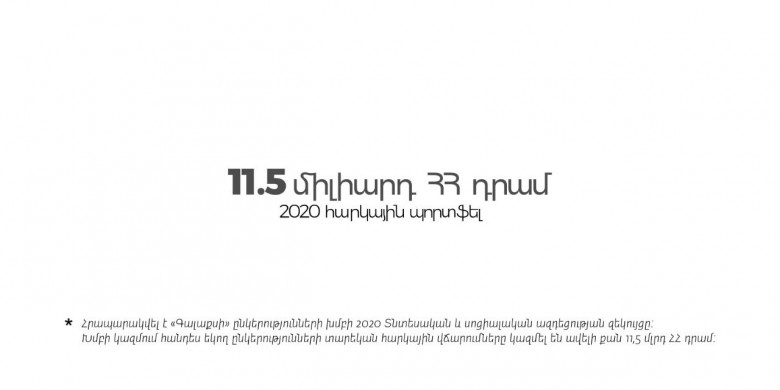 «Գալաքսի» ընկերությունների խմբում 2020թ.-ին միջին ամսական աշխատավարձը եղել է 364,716 ՀՀ դրամ, և պետական բյուջե է փոխանցվել ավելի քան 2 մլրդ ՀՀ դրամ եկամտային հարկ։ Ընկերությունների խմբի վարկային պորտֆելը 2020թ. տվյալներով կազմել է մոտ 60 միլիարդ ՀՀ դրամ (մոտ 115 միլիոն դոլար)։ Տեղական շուկայից գնումները կազմել են մոտ 36 մլն ԱՄՆ դոլար: