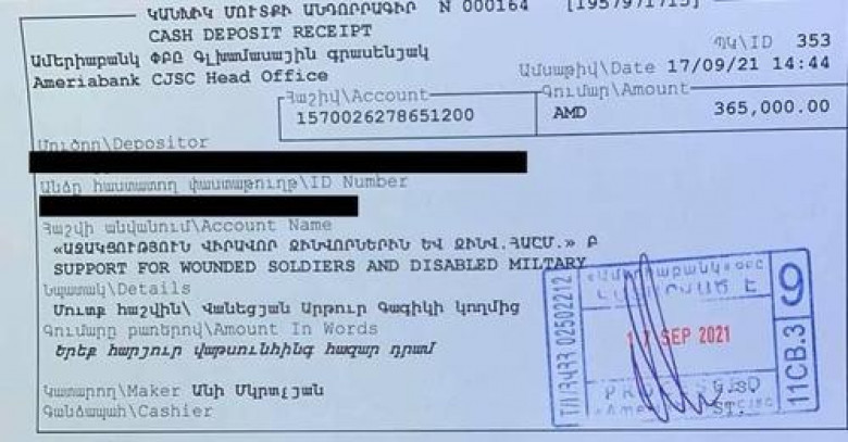 Քաղաքական«Պատիվ ունեմ» խմբակցության ղեկավար Արթուր Վանեցյանն այսօր որպես պարգեւավճար ստացած 365 հազար դրամը փոխանցել է զինվորների բուժօգնության համար։