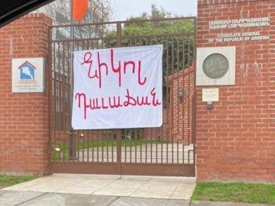 «Նիկոլ դավաճան» ցուցանակը` Գլենդելում ՀՀ գլխավոր հյուպատոսարանի դարպասի վրա