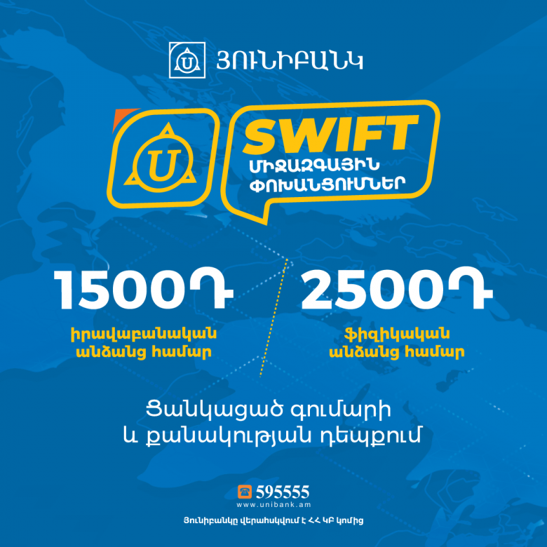 Յունիբանկն իջեցրել է Swift դրամական փոխանցումների սակագինը մինչև 1500 դրամ