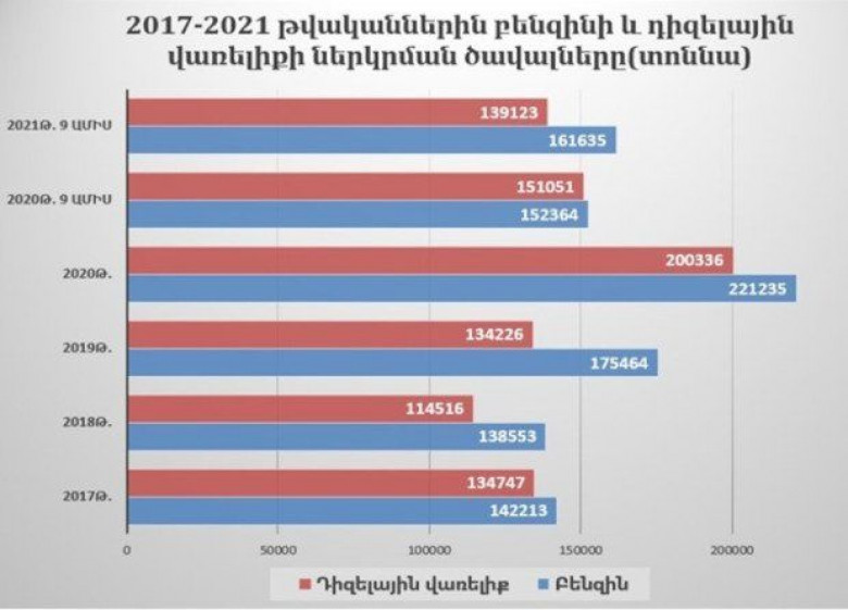 Հարկ է նշել, որ 2020 թվականին Հայաստան է ներկրվել 221235 տոննա բենզին և 200336 տոննա դիզելային վառելիք, որը 2019 թվականի համեմատ ավելի է համապատասխանաբար՝ 45771 տոննայով և 66110 տոննայով, այսինքն՝ բենզինի ներկրումը աճել է 26 տոկոսով, իսկ դիզելային վառելիքինը՝ 49,2 տոկոսով։ Վառելիքի ներկրման զգալի աճը հիմնականում պայմանավորված է 2020 թվականի 4-րդ եռամսյակի ընթացքում սպառման ծավալների ավելացմամբ, մասնավորապես՝ 44-օրյա պատերազմական գործողություններով և դրանից հետո զարգացումներով։