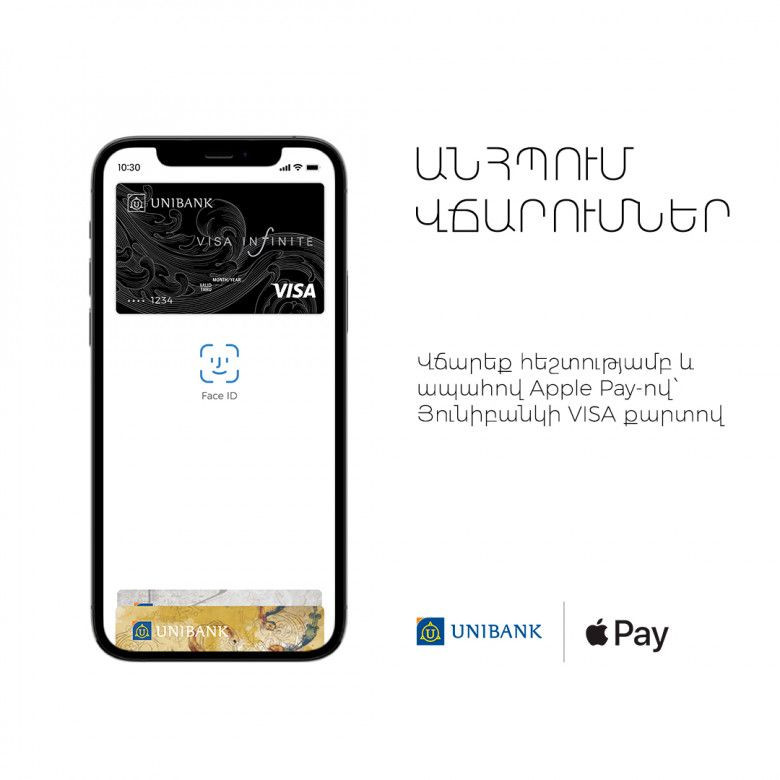Յունիբանկ ԲԲԸ-ի հաճախորդներն այսօրվանից կարող են օգտվել վճարման ավելի ապահով, անվտանգ և վստահելի գործիքից՝ Apple Pay-ից, որը նրանց կօգնի խուսափել իրենց վճարային քարտը ուրիշին հանձնելուց, վճարային տերմինալի կոճակներին հպվելուց կամ կանխիկ գումար փոխանակելուց: Apple Pay-ի միջոցով իրականացվող յուրաքանչյուր գործարքի պաշտպանությունն իրականացվում է iPhone-ի նորարարական տեխնոլոգիաների միջոցով: