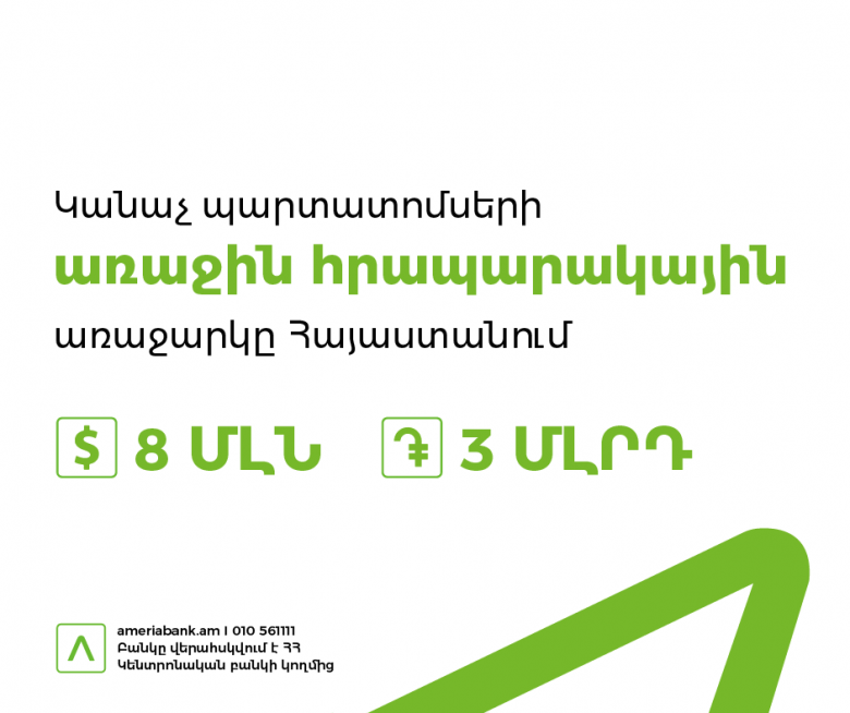 ՏնտեսությունԱմերիաբանկը փետրվարի 14-ից ապրիլի 22-ը ներառյալ իրականացնում է 8 մլն ԱՄՆ դոլար և 3 մլրդ ՀՀ դրամ ծավալով անվանական, արժեկտրոնային, ոչ փաստաթղթային պարտատոմսերի հրապարակային տեղաբաշխում: Սա Հայաստանում կանաչ պարտատոմսերի` հրապարակային առաջարկի միջոցով իրականացվող առաջին տեղաբաշխումն է: Կանաչ պարտատոմսերի տեղաբաշխումից ստացված միջոցներն ուղղվելու են «կանաչ ակտիվների» ֆինանսավորմանը: