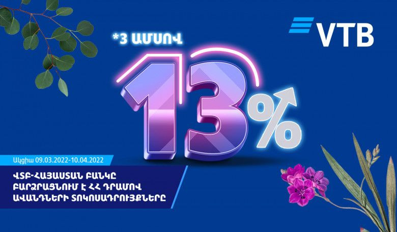 ՏնտեսությունԱկցիայի շրջանակներում ՎՏԲ-Հայաստան Բանկը բարձրացնում է ֆիզիկական անձանց՝ ՀՀ դրամով «Շահավետ» և «Պրոգրես» ավանդների տոկոսադրույքները: Ավանդների առավելագույն տոկոսային եկամտաբերությունը հասնում է տարեկան 13,49%-ի։