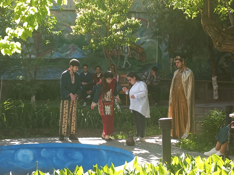 Վստահ էի, որ դեռ պատմելու եմ նաև թատերախմբի գործունեության մասին: Մի առիթով խմբի ղեկավարը՝ Մարինեն, ասաց, որ պետք է անպայման դիտեմ իրենց ներկայացումներից մեկը, միայն այդպես նյութն ամբողջական կլինի: Ճիշտ էր: Հրավիրեցին թանգարանի այգի, որտեղ մեզ դիմավորեցին գեղեցիկ հագնված, անհամբեր դերասանները, այդքան հմայիչ թագավոր վաղուց չէի տեսել: Տեղավորվեցինք Հովհ. Թումանյանի կնոջ՝ Օլգայի և նրա աղջիկների տնկած ծառերի տակ: Մարինեն ասում է՝ այգում ներկայացում խաղալու որոշումը պատահական չի եղել՝ ամեն ինչ անում են բնության մի մասնիկը մնալու համար: Պատանի ու երիտասարդ դերասանները կարողացան հանդիսատեսին փոխանցել թումանյանական խոսքը՝ նրա անմահ հեքիաթների միջոցով: Ներկայացումը Թումանյանի տարբեր հեքիաթների միաձուլումն էր, բեմում դերասանները, որոնք վաղուց արդեն ընտանիք են դարձել: Ավարտին հարց հնչեց՝ ի՞նչ եք գտել թատրոնում, պատասխանները հուզեցին ու զարմացրեցին՝ «խաղաղություն, հանգստություն, ընկերներ, ընտանիք, կարոտ, կյանքի ճիշտ ուղի, սեր ու ջերմություն, հրեշտակներ, ապրելու նոր հույս»: