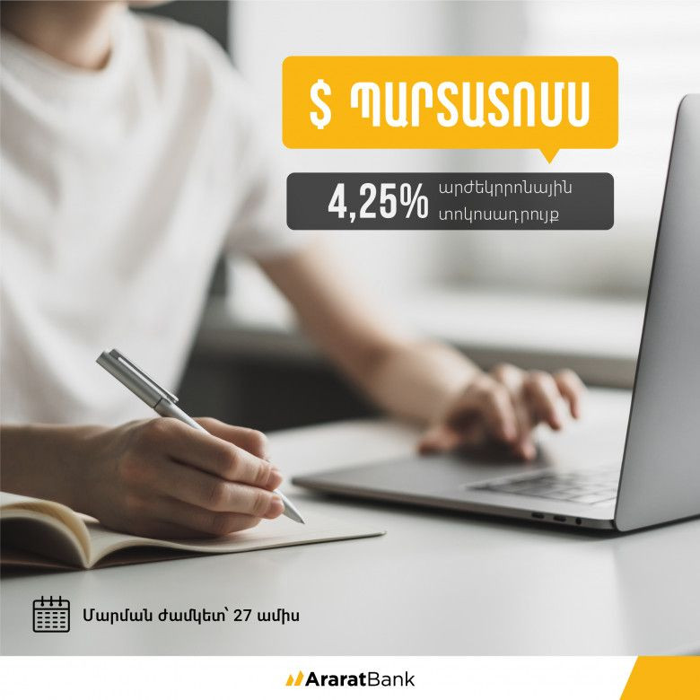ՏնտեսությունՍույն թվականի սեպտեմբերի 08-ին ԱՐԱՐԱՏԲԱՆԿ բաց բաժնետիրական ընկերությունը կթողարկի 2022 թվականի երկրորդ դոլարային տրանշը՝ հետևյալ պայմաններով։