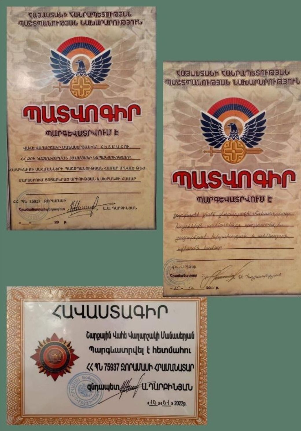Զոհվելու նախորդ օրը երեկոյան խոսել է տան անդամների հետ, հարցրել, թե «գանձերը ո՞նց են»: «Քույրիկներին գանձեր էր ասում: Վահեիս զոհվելուց առաջ երազ տեսա, երազ էլ չէր, տեսիլք էր, բայց այդ ժամանակ չհասկացա: Զոհվելու առավոտյան քույրիկներին գրել էր՝ «ո՞նց եք, գանձերս, ձեզ լավ նայեք, լավ եղեք»: Տեսիլքիս մասին չեմ պատմի, բայց կարծես զգուշացնում էր ինձ, թե ինչ է լինելու, զգում էի, որ մի բան այն չէ: Միշտ զգացել ենք իրար, կապված էինք իրար հետ: Անգամ, երբ չէր պատմում, թե ինչ է իր հետ կատարվում, միևնույնն է՝ գիտեի, անգամ ինքն էր զարմանում, ասում էր՝ մերս, որտեղի՞ց գիտես, քեզ ո՞վ ա ասել: Առհասարակ, մեր ընտանիքում բոլորիս մեջ փոխադարձ վստահություն կա, քույրերն ու Վահեն կապված էին իրար հետ, կիսվում էին, միմյանց գաղտնիքներ վստահում»,վերհիշում է տիկին Երանուհին: Ժամանակ առ ժամանակ արցունքներով ընդհատվող զրույցի ընթացքում մայրիկը վերապրում է ցավը, որն իրեն հավերժ է ուղեկցելու: