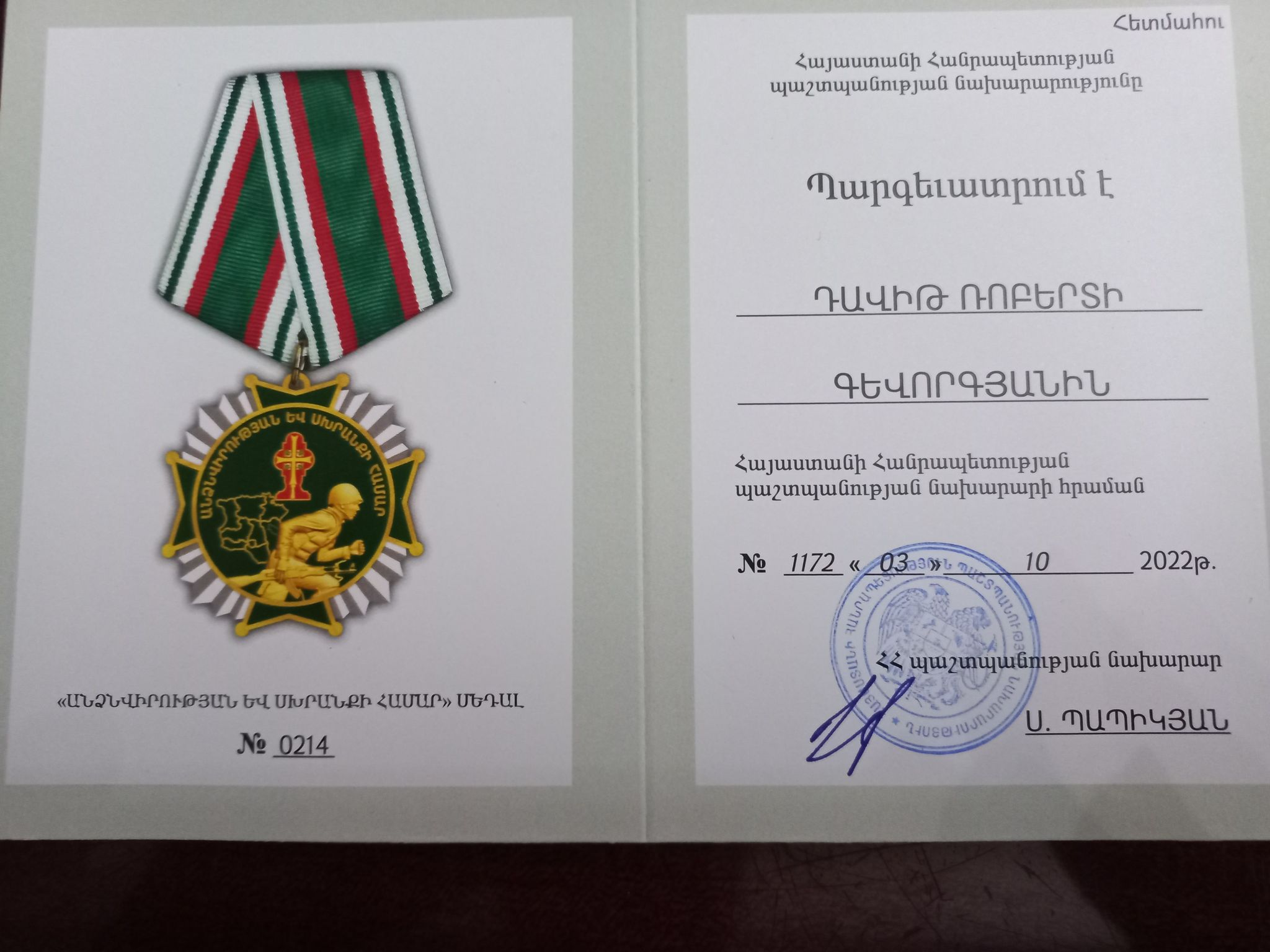 Պատերազմի ընթացքում օգնություն է ցուցաբերել շատ վիրավորների՝ փրկելով բազմաթիվ կյանքեր: Նրա շնորհիվ շատ վիրավորներ կարողացել են քայլել և շարունակել պայքարը: 2020 թ.-ի հոկտեմբերի 26-ին դիրքի վրա կատարված հարձակման ժամանակ ծանր վիրավոր Ա. Խաչատրյանին խրամատից ապահով վայր տեղափոխելիս չի լքել նրան, երբ շարունակվել է արկերի տարափը: Հերթական արկի հարվածային ալիքից վիրավորը մի կողմ է շպրտվել՝ ողջ մնալով, իսկ նրան փրկող ֆելդշերը՝ Դավիթը, զոհվել է»,-եզրափակում է կյանքեր փրկող ֆելդշերի մայրիկը: Հ. Գ. Դավիթ Ռոբերտի Գևորգյանն Արցախի Հանրապետության սահմանը պաշտպանելիս ցուցաբերած արիության և խիզախության համար ԱՀ նախագահի հրամանագրով հետմահու պարգևատրվել է «Մարտական ծառայություն» մեդալով: ՀՀ պաշտպանության նախարարի հրամանագրով պարգևատրվել է «Անձնվիրության և սխրանքի համար» մեդալով: