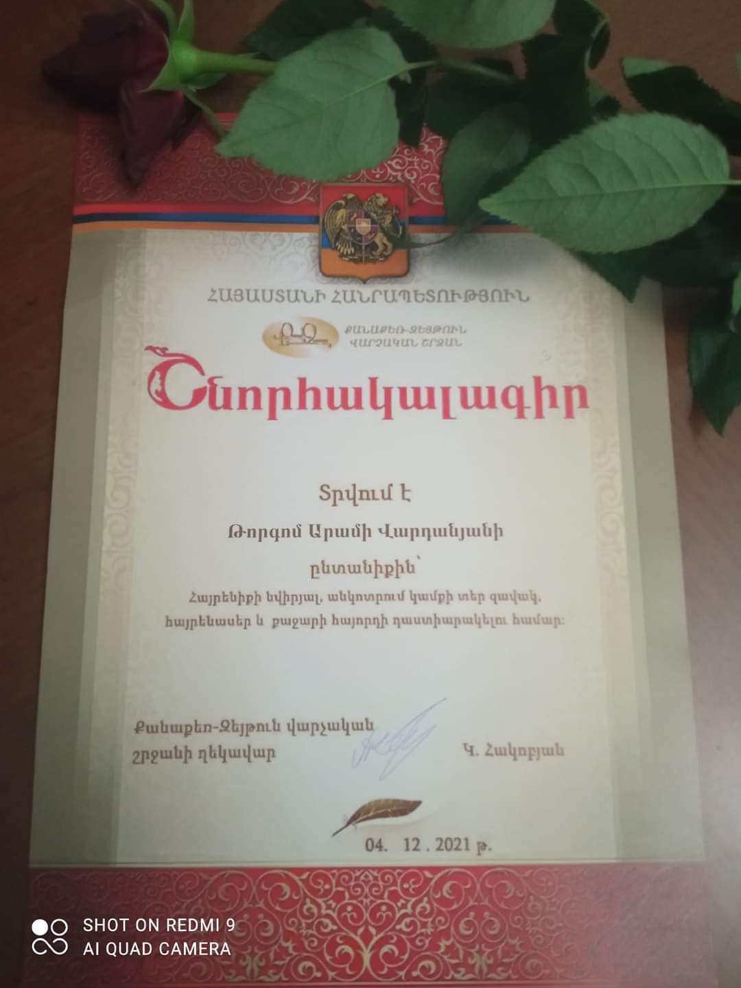Հ. Գ. - Թորգոմ Վարդանյանը Հանրապետության նախագահի հրամանագրով հետմահու պարգևատրվել է «Մարտական ծառայության» մեդալով: Արցախի նախագահի հրամանագրով հետմահու պարգևատրվել է «Մարտական խաչ» 2-րդ աստիճանի շքանշանով: