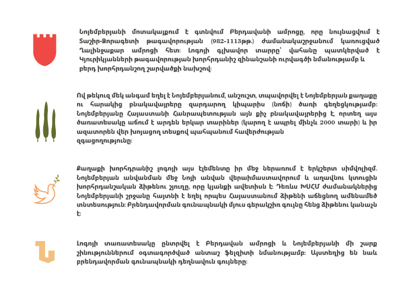 Ուրախությամբ հայտնում ենք, որ «Ապրելու» հիմնադրամի և «Սկևռա» քաղաքային պլանավորման ինստիտուտի հետ համագործակցությամբ արդեն ունենք մեր սիրելի Նոյեմբերյանի բրենդը։ Բրենդի նկարագրությունն ու կոնցեպտը սիրով ներկայացնում ենք ձեր ուշադրությանը։