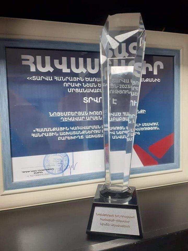 ՔաղաքականԵվս մեկ կարևոր գնահատական մեր թիմի արած աշխատանքին Նոյեմբերյան համայնքում․ այստեղ համայնքի ղեկավար, «Ապրելու երկիր» կուսակցության քաղաքական խորհրդի անդամ Արսեն Աղաբաբյանն արժանացել է մրցանակի «Համայնքային կառավարման լավագույն մոդելի մշակում, հանրային աշխատանքներում ակտիվ ներգրավվածություն, բարեխիղճ աշխատանք» անվանակարգում «Տարվա հանրային ծառայող, տարվա ապրանքանիշ որակի նշան Երևան 2023» մրցանակաբաշխության ժամանակ։