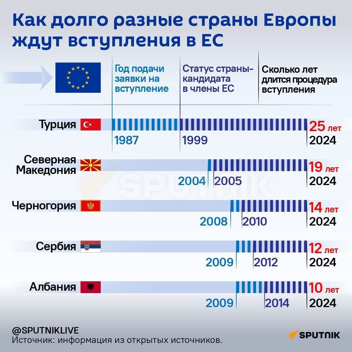Թուրքիան, օրինակ, 1987 թվականից սպասում է իր անդամակցությանը, սակայն չլուծված խնդիրները շարունակում են խանգարել գործընթացին: Միևնույն ժամանակ, Խորվաթիան 2003-ից մինչև 2013 թվականը կատարեց անհրաժեշտ քայլերը և դարձավ ԵՄ անդամ։