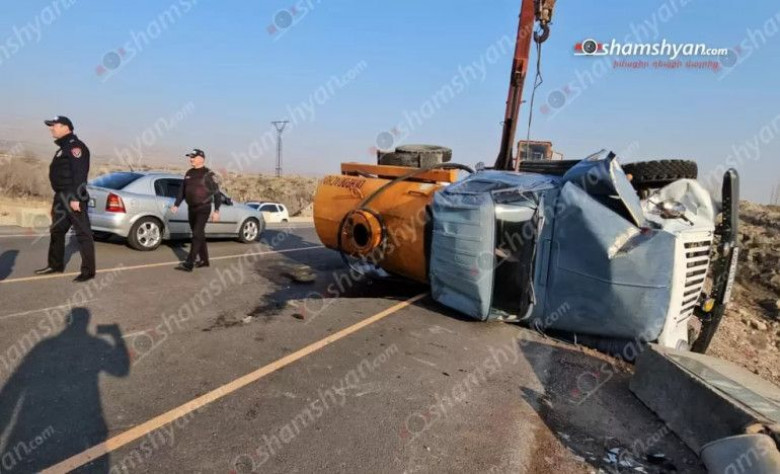 Երևան-Գյումրի ավտոճանապարհին դիզվառելիք տեղափոխող բեռնատարը բախվել է արգելապատնեշներին և կողաշրջվել