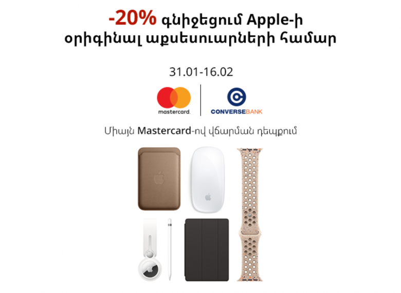 ՀասարակությունԿոնվերս Բանկն իր Mastercard քարտապաններին առաջարկում է միանալ Mastercard միջազգային վճարահաշվարկային համակարգի և Apple ապրանքանիշի համատեղ արշավին, 31.01.25 - 16.02.25թթ. գնել Apple գաջեթներ կամ աքսեսուար iSpace, Vega, Team Armenia, UCOM, VLV, iStore խանութներից և ստանալ.
