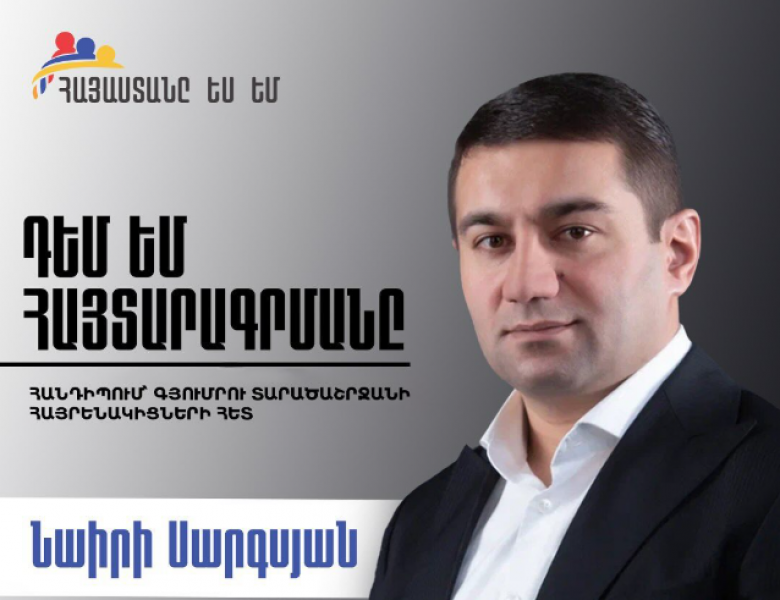 «Հայաստանը ես եմ» նախաձեռնության ղեկավարը Նաիրի Սարգսյանը «Դեմ եմ հայտարարագրմանը» ակցիային շրջանակներում կհանդիպի Գյումրու տարածաշրջանի բնակիչների հետ։