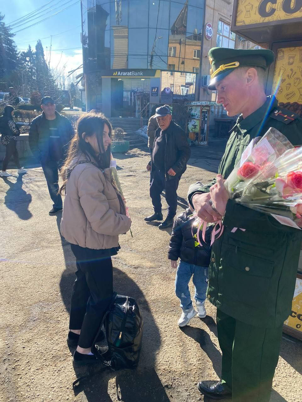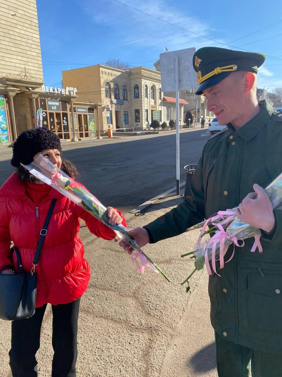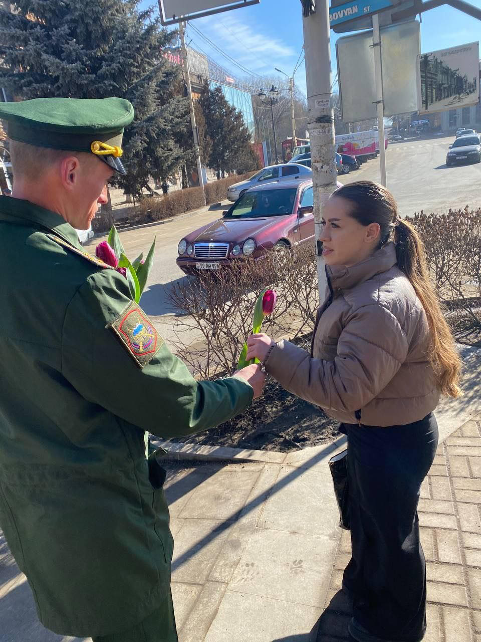 Այսօր ռազմաբազայի սպաները Գյումրիի փողոցներում Հայաստանի գեղեցիկ սեռի ներկայացուցիչներին ծաղիկներ են նվիրել։