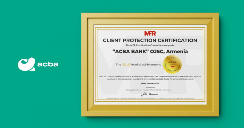 ՀասարակությունԱկբա բանկը միջազգային հեղինակավոր MFR գործակալության կողմից արժանացել է «Հաճախորդների պաշտպանության հավաստագրման» (Customer protection certification) ամենաբարձր՝ ոսկե մակարդակի։