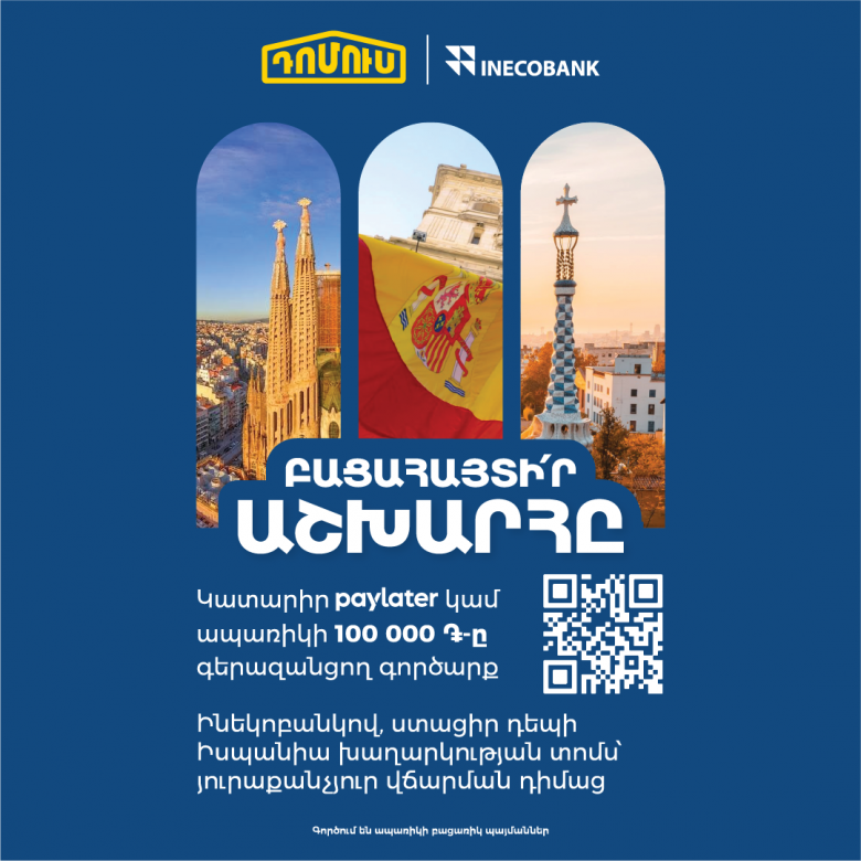 Մայիսի 8-ից մինչև հունիսի 8-ը ներառյալ արի՛ Դոմուս հիպերմարկետների ցանց, ընտրի՛ր 100,000 ՀՀ դրամ և ավել արժողությամբ վերանորոգման պարագաներ, տեխնիկա կամ կահույք, ձևակերպի՛ր 16 ամիս անտոկոս ապառիկ (17-րդ ամսից մինչև18․99% տարեկան փաստացի տոկոսադրույք) Ինեկոբանկի միջոցով կամ վճարի՛ր paylater-ով, ավտոմատ կերպով դարձի՛ր խաղարկության մասնակից և ստացի՛ր հնարավորություն շահելու ուղևորություն դեպի Բարսելոնա՝ երկու անձի համար։