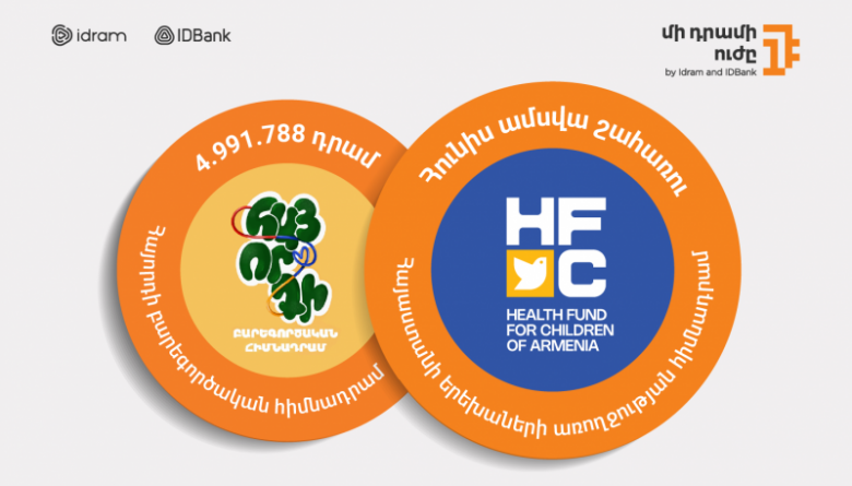«Մի դրամի ուժի» բարի գործերին մասնակից դառնալու համար ընդամենը Ձեր բոլոր վճարումները կատարեք Idram&IDBank հավելվածով, IDBanking.am և banking.idram.am առցանց հարթակներով, Իդրամի և IDBank-ի տերմինալներով, և Ձեր յուրաքանչյուր վճարման դիմաց ընկերությունները մեկ դրամ կուղղեն կարևոր ծրագրերին։