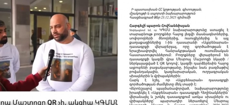 Հիշեցնում եմ, որ 2025 թվականի հոկտեմբերի 23-ին «Հայրենիք» կուսակցության երիտասարդ անդամները ԿԳՄՍ նախարարության շենքի դիմաց իրականացրեցին «Այբ Արարատ» խորագրով մշակութային բողոքի ակցիա, որը ուներ հստակ պահանջ՝ վերացնել QR կոդը այբենարաններից և վերադարձնել Մեսրոպ Մաշտոցի պատկերը՝ իր ԱՅԲ-ով հանդերձ, որպես հայ դպրության, մշակույթի և ինքնության անփոխարինելի խորհրդանիշ։