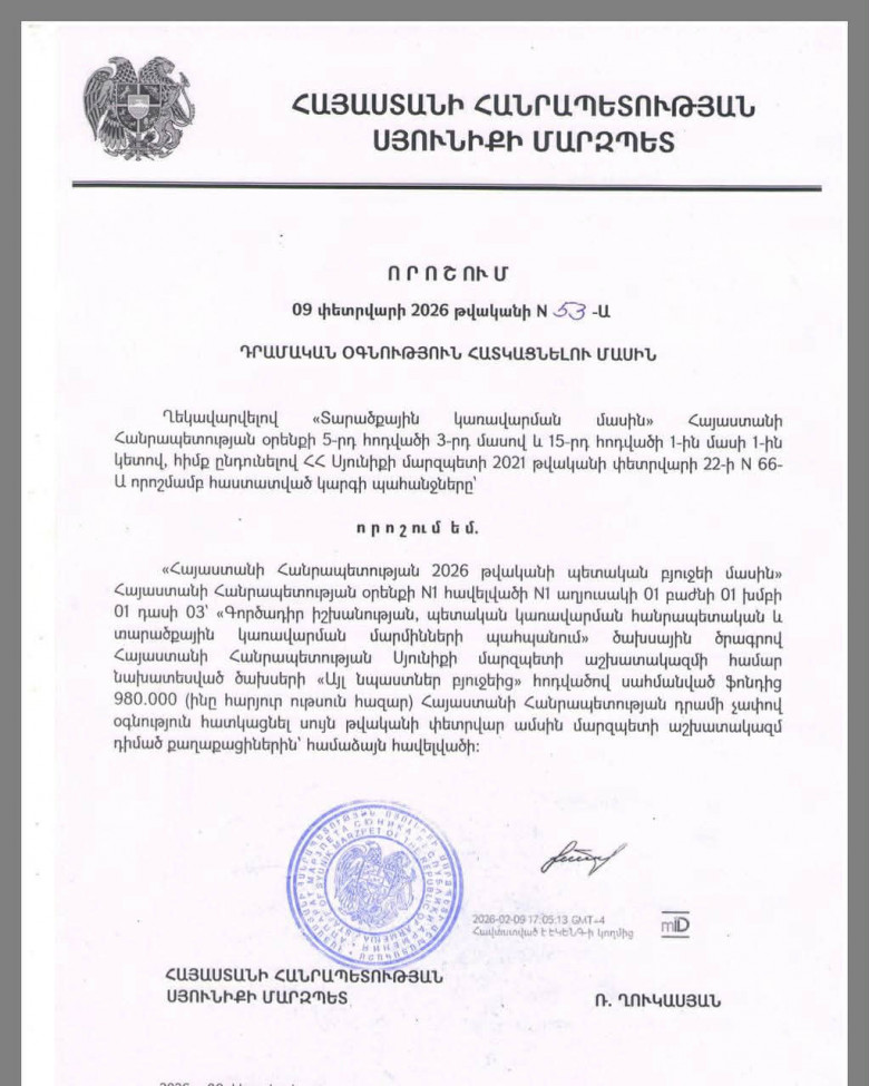 ՀասարակությունՍյունիքի մարզպետը ֆինանսական աջակցություն է բաժանել բնակիչներին Փետրվարի 9-ին՝ հրամանագրի ուժի մեջ մտնելուց ընդամենը երկու օր անց, Սյունիքի մարզպետը որոշում է ստորագրել՝ մարզի բնակիչներին ֆինանսական աջակցություն տրամադրելու վերաբերյալ։ Քրեական օրենսգրքի համաձայն՝ ընտրակաշառքի հանցագործության համար համար կարող է սպառնալ մինչև 10 տարվա ազատազրկում։ Այս պահի դրությամբ իրավապահ մարմինները դեռևս պաշտոնական որոշում չեն կայացրել՝ գործով քրեական վարույթ նախաձեռնելու վերաբերյալ։