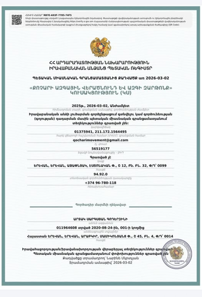 Դեղերի շուկայում կա ազատականացման խնդիր․ Նարեկ ԿարապետյանԸստ Դատախազության պաշտոնական տեղեկության՝ ապօրինի ծագում ունեցող գույքի բռնագանձման լիազորությունների շրջանակում հօգուտ ՀՀ-ի բռնագանձվել է 5 մլրդ 454 մլն դրամի գույք և դրամական միջոցներ․ Էդմոն ՄարուքյանՈչ միայն իջեցնելու ենք դեղերի գները, այլև գրանցման պրոցեսն ենք դյուրացնելու. Նարեկ ԿարապետյանԴե՞ղ, թե՞ հաց. մեր հայրենակիցները, ցավոք, հաճախ այս այլընտրանքի առաջ են կանգնում. Նարեկ ԿարապետյանԹոշակների բարձրացումը նախընտրական քայլ է և կարող է դիտարկվել որպես ընտրակաշառք․ Ավետիք ՉալաբյանՍահմանամերձ գյուղերի հիսունհինգ դպրոց կփակվի․ Մենուա ՍողոմոնյանՆարեկ Կարապետյանի ուղիղ եթերըԿողմնորոշվեք, պարոնայք. Արմեն ԱշոտյանԱյս Կուսակցության գրանցումով ես ինձ հետ չեմ տանում ո՛չ զայրույթ, ո՛չ ափսոսանք, միայն երախտագիտություն. Արտակ ՍարգսյանՄենք չենք մտնելու պոպուլիզմի դաշտ․ Նաիրի ՍարգսյանՏեղ հասա՞վ, որ Իրանի ժողովրդին պետք է ցավակցել. Արշակ ԿարապետյանՀաճախորդների շնորհակալության օր Էջմիածին մասնաճյուղում․ IDBankԱռաջիկա երկու տարիներին իջեցնելու ենք դեղերի գները 30%-ով․ Հրայր ԿամենդատյանԱրցախի հարցը և արցախահայերի իրավունքները «ՀայաՔվեի» ուշադրության կենտրոնում են․ Ավետիք Քերոբյան.Փաշինյանի թույլ կառավարությունը վախենում է նույնիսկ Ֆեյսբուքյան էջից. Մարիաննա Ղահրամանյան 250 օր զրպարտված և ապօրինի կալանավորվածԴուխ հավաքիր ու ցավակցիր հարևանիդ. երեխաներ են զոհվում, հասկացիր․ Արշակ ԿարապետյանOzon Հայաստան-ի շրջանառությունը 2025 թվականին աճել է գրեթե 1,5 անգամ Նկատվում է կենսաթոշակային տարիքը բարձրացնելու միտում. Դավիթ ՀակոբյանՓաշինյանը «Մարտի 1»-ն օգտագործելու է քարոզչական նպատակներով Իրանի դեմ պատերազմը անդառնալիորեն փոխում է տարածաշրջանի պատկերը Փաշինյանը շարունակում է խուսանավել մոդուլային ատոմակայանի հարցում Ստեղծվել են արևային վահանակներ, որոնք էներգիա են ստանում նաև անձրևի կաթիլներից Վանաձորում բախվել են «Opel Zafira»-ն և «Opel Vectra»-ն. կա 9 վիրավnր Այս օրերի իրադարձությունների ծանր հետևանքները տասնամյակներով զգացնել են տալու տարածաշրջանի, այդ թվում` Հայաստանի վրա․ Տիգրան Աբրահամյան Մերձավոր Արևելքում ստեղծված իրավիճակի հետևանքով չեղարկվել են մի շարք չվերթեր դեպի Երևան և Երևանից Թրամփը կարծում է, որ Իրանում ռшզմական գործողությունը կարող է տևել մինչև մեկ ամիս Ինչպե՞ս երկպալատ պառլամենտը կարող է նպաստել ժողովրդավարությանն ու օրենքի գերակայությանըՀանքաքարի մատակարարումից մինչև մանրացում՝ ԶՊՄԿ-ում ամերիկյան աղացները ձևավորում են արտադրության հզոր ռիթմըԵթե այս պատերազմը երկարի, ապա ծայրահեղ ծանր իրավիճակ կարող է լինել միջազգային առևտրի, բիզնեսի, ֆինանսական, նավթային, գազային շուկաների համար. ՄարուքյանՔպ վարչախումբը գողանում է հայաքվեի մտքերը. Հրայր ԿամենդատյանԱյն մասին, թե ինչու ենք մենք միավորում մեր ուժերը այլ գաղափարակից կառույցների հետ, և ինչու է դա բերելու հաջողության առաջիկա ընտրություններին. Չալաբյան20 000 մատչելի բնակարան պետական աջակցությամբ. Գոհար ՂումաշյանԱնկայուն աշխարհի ֆոնին՝ խորացող ներքին ճգնաժամ Հայաստանի թեկնածուն. «Միասնության թևերը» ներկայացրեց իր քաղաքական օրակարգը ԶՊՄԿ-ն` Կանադա-Եվրասիական պալատի անդամ. հանքարդյունաբերության ոլորտում նոր էջ է բացվումՄոտ 500,000 մարդ չունի արժանապատիվ աշխատանք. հաջորդ վարչապետ Սամվել Կարապետյանը շուտով կփոխի այս իրավիճակըՄհեր Ավետիսյանը առաջարկել է Իրանի դեսպանատան առջև ծաղիկներ, մանկական խաղալիքներ տեղադրենք«Ինտերը» տանը հաղթեց «Ջենոային»․ Մխիթարյանը՝ գոլային փոխանցման հեղինակ Սարդար Վահիդին ն